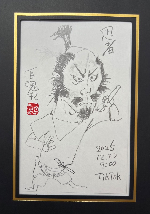 ■ TikTok live 2025.12.22 9:00 ’忍者’(紙額入り) 忍者アートが、TikTokライブで誕生しました!この作品は、百鬼丸が生配信で制作した特別な一品。生の創作過程から生まれる独自性をお楽しみください! 百鬼丸の深いアートへの情熱が感じられます。 このアートは、アート好きには欠かせないアイテム!ぜひコレクターになってこのライブ作品を集めてください。