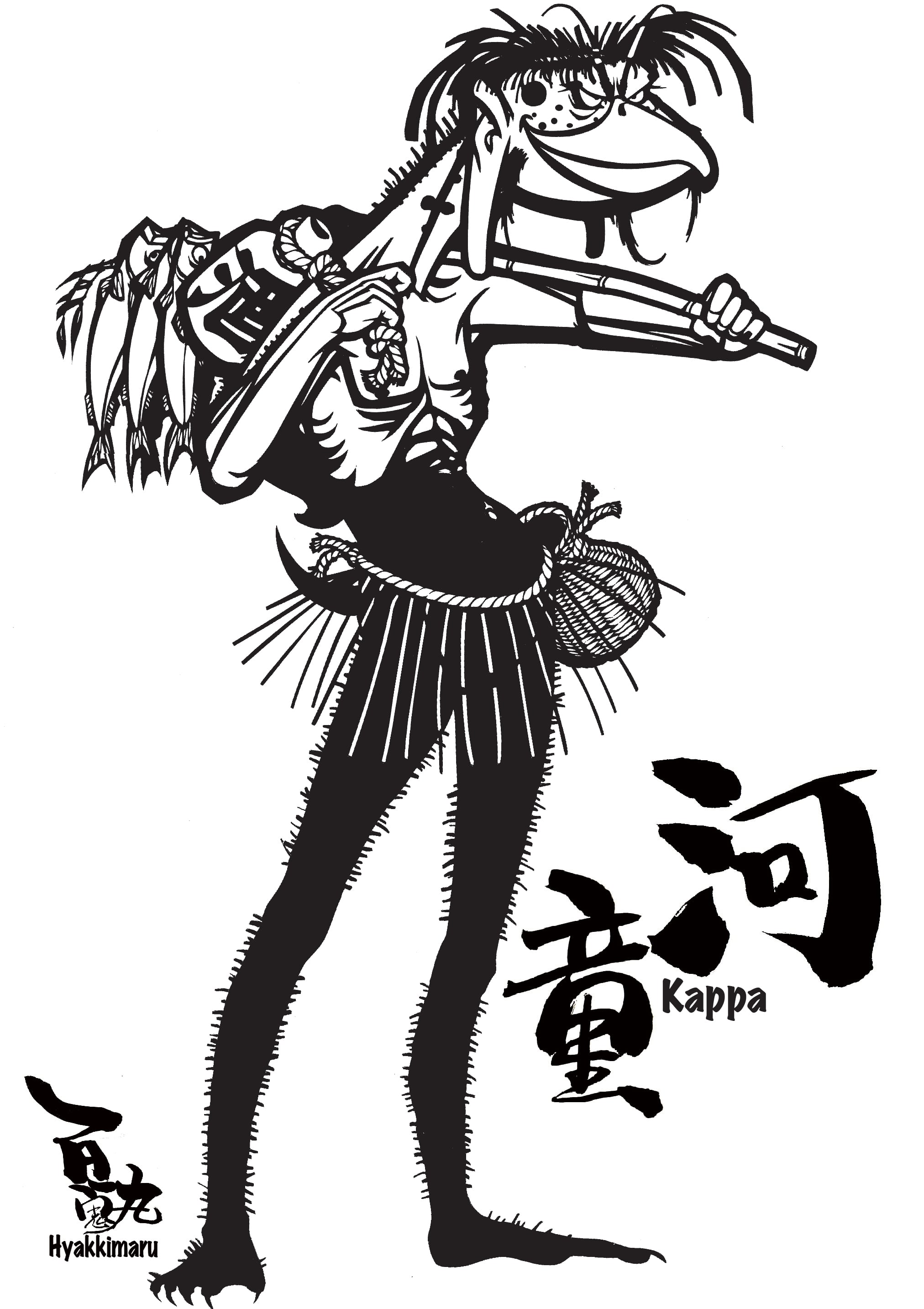 [河童」百鬼丸の手刷りTシャツ シルクプリント(バックプリント、前プリントはロゴ)